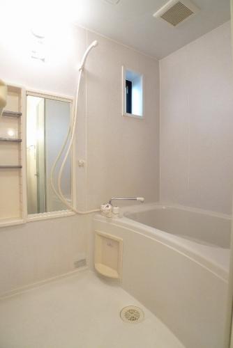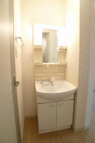 1Kバス・トイレ別間取りです。室内洗濯機置き場、独立洗面台、温水洗浄便座付きで設備充実しています。防犯シャッター付きで防犯対策ばっちり。