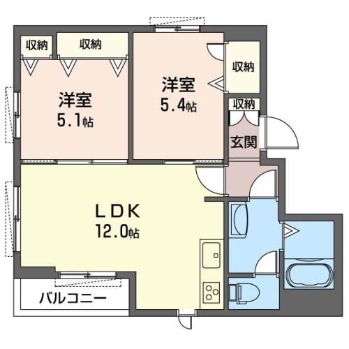 居室振り分けタイプの2LDKのお部屋です。各居室に収納あり。設備充実しています。