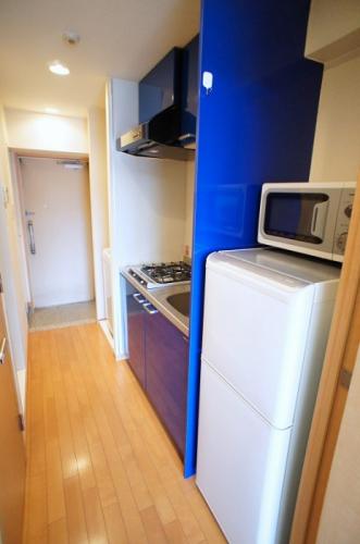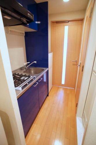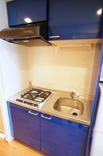 キッチンは綺麗なブルーでまとめています。ガスコンロが2口付いた、システムキッチンを採用しているので、1Kでありながら、クッキングも快適です。